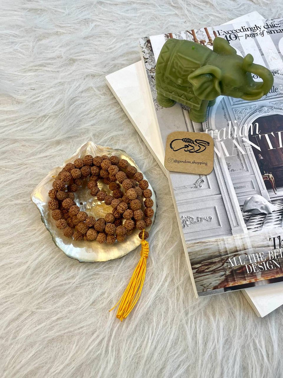 تسبیح رودراکشا ۱۰۸ عددی بدون حنا با نخ زرد رنگ