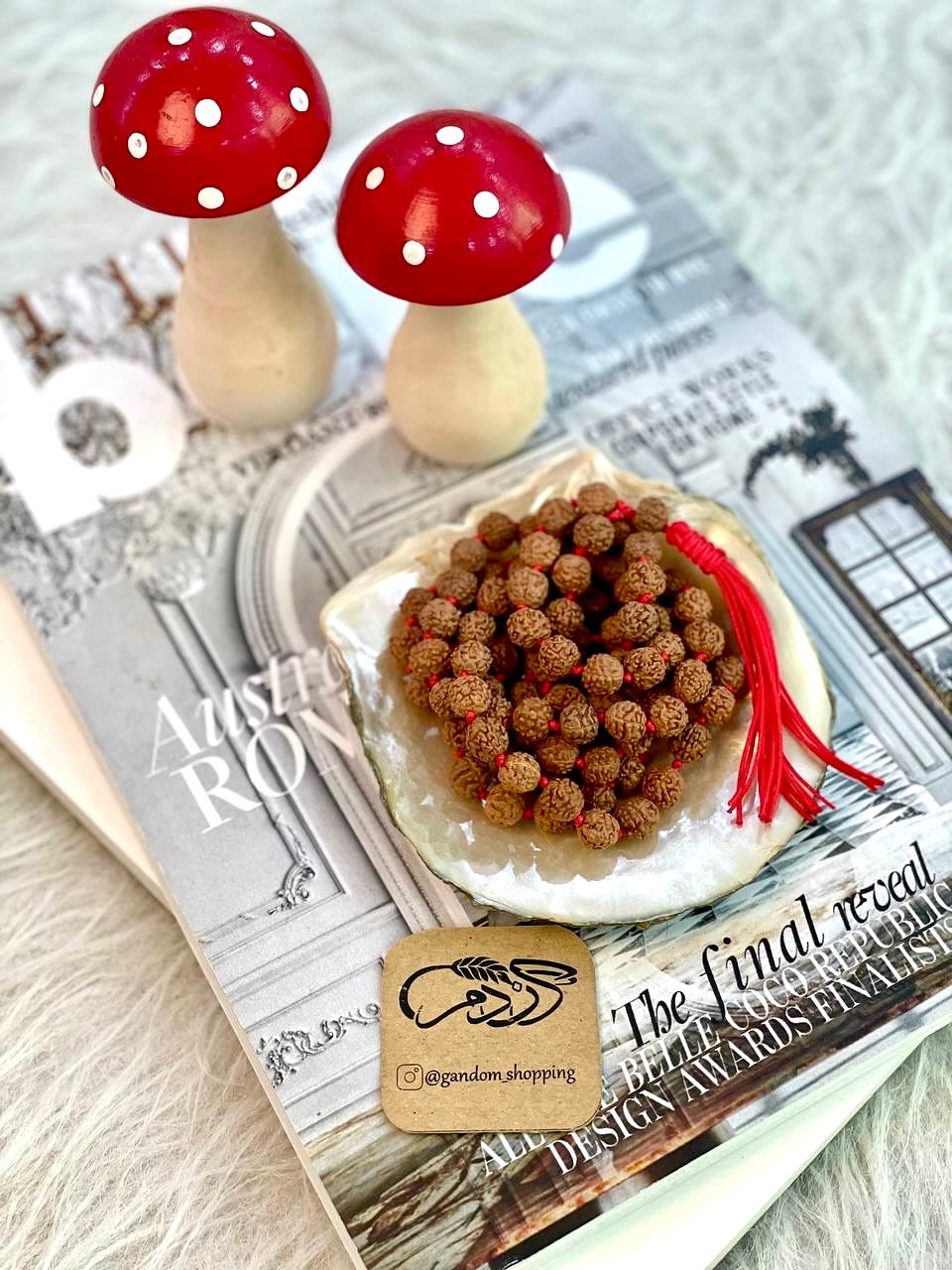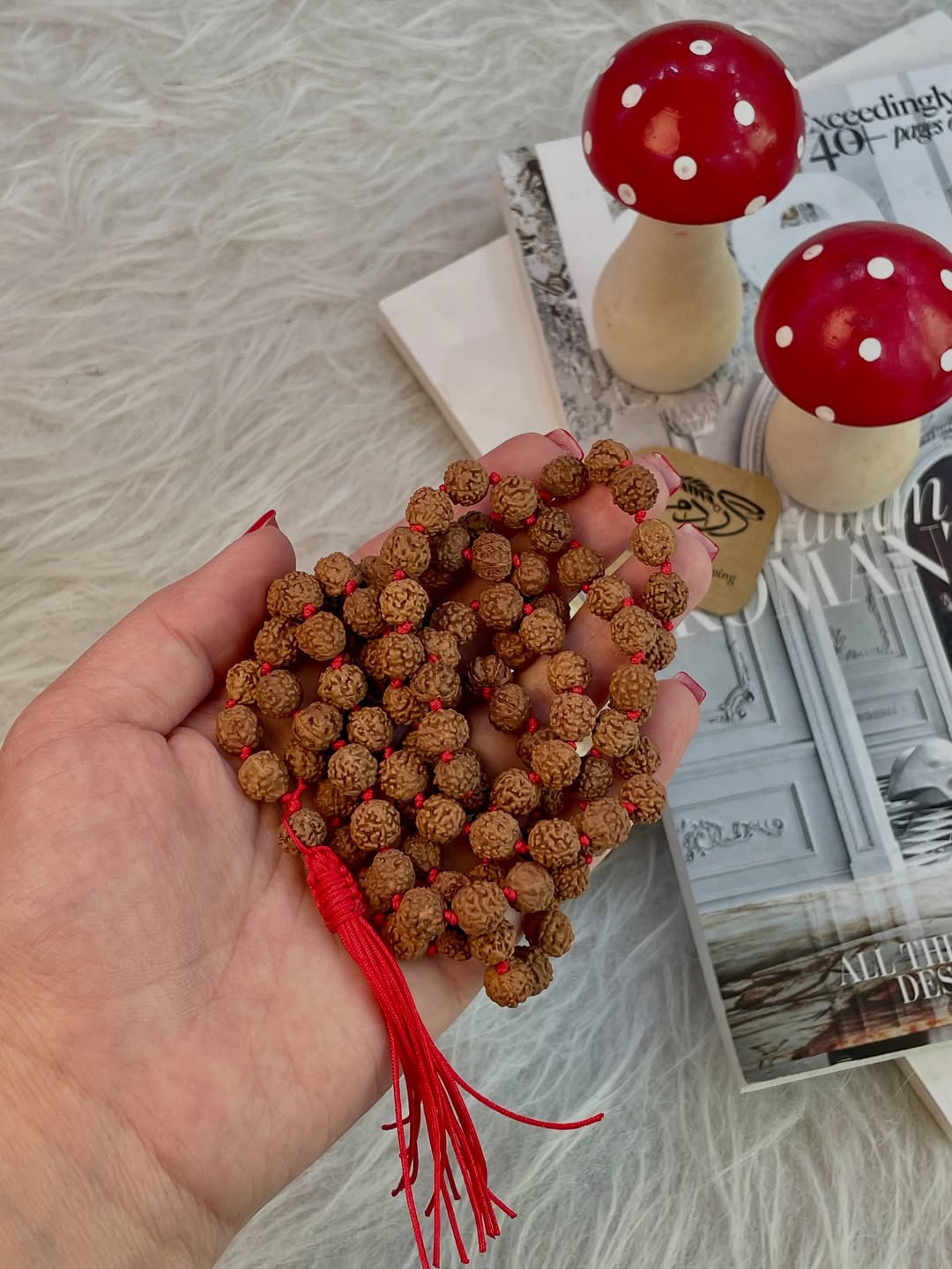 مهرههای طبیعی از دل درخت رودراکشا که برای تقویت انرژی و آرامش استفاده میشود. با رنگ نخ قرمز. بدون حنا و رنگ کاملا طبیعی